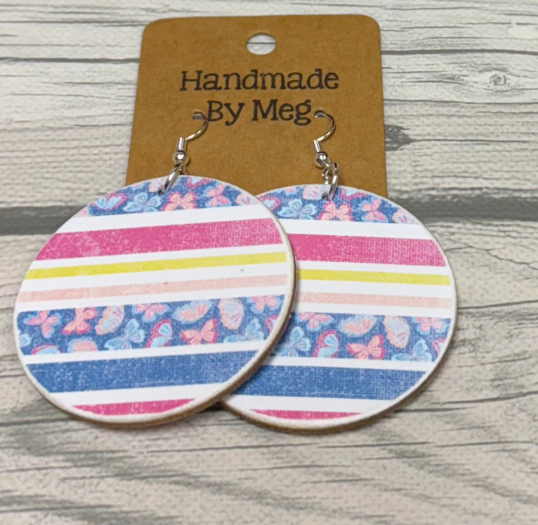 Effortlessly elevate your style with our 2 inch Bright Stripe with Butterflies Earrings. Handcrafted with a chic print on both sides, these earrings are sure to add the perfect touch to any outfit. Measuring 2 inches in diameter, they are the perfect size for everyday wear.