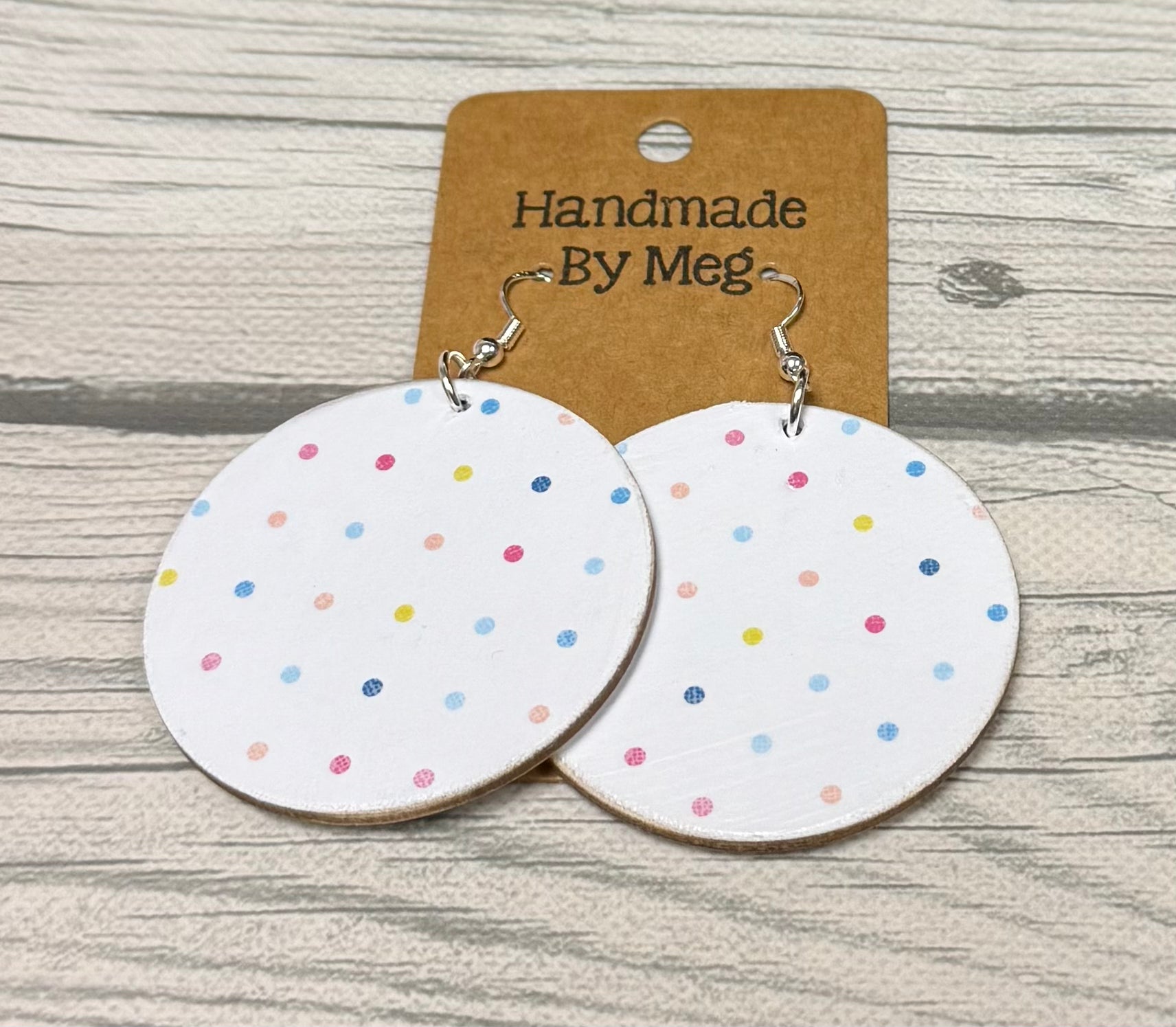 Effortlessly elevate your style with our 2 inch Multi Polkadot Earrings. Handcrafted with a chic print on both sides, these earrings are sure to add the perfect touch to any outfit. Measuring 2 inches in diameter, they are the perfect size for everyday wear.