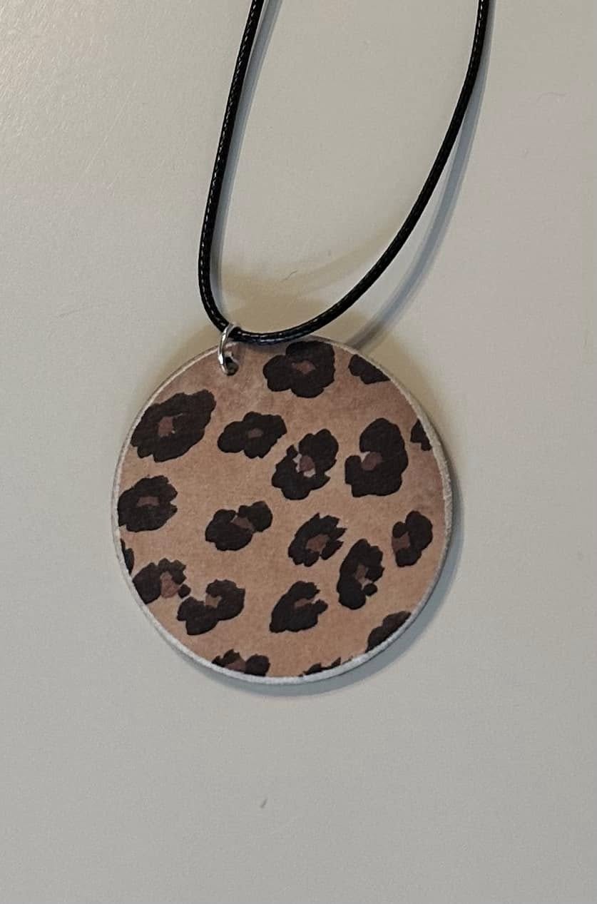 Stylish, handcrafted necklace with animal print on both sides, pendant measuring 2 inches.