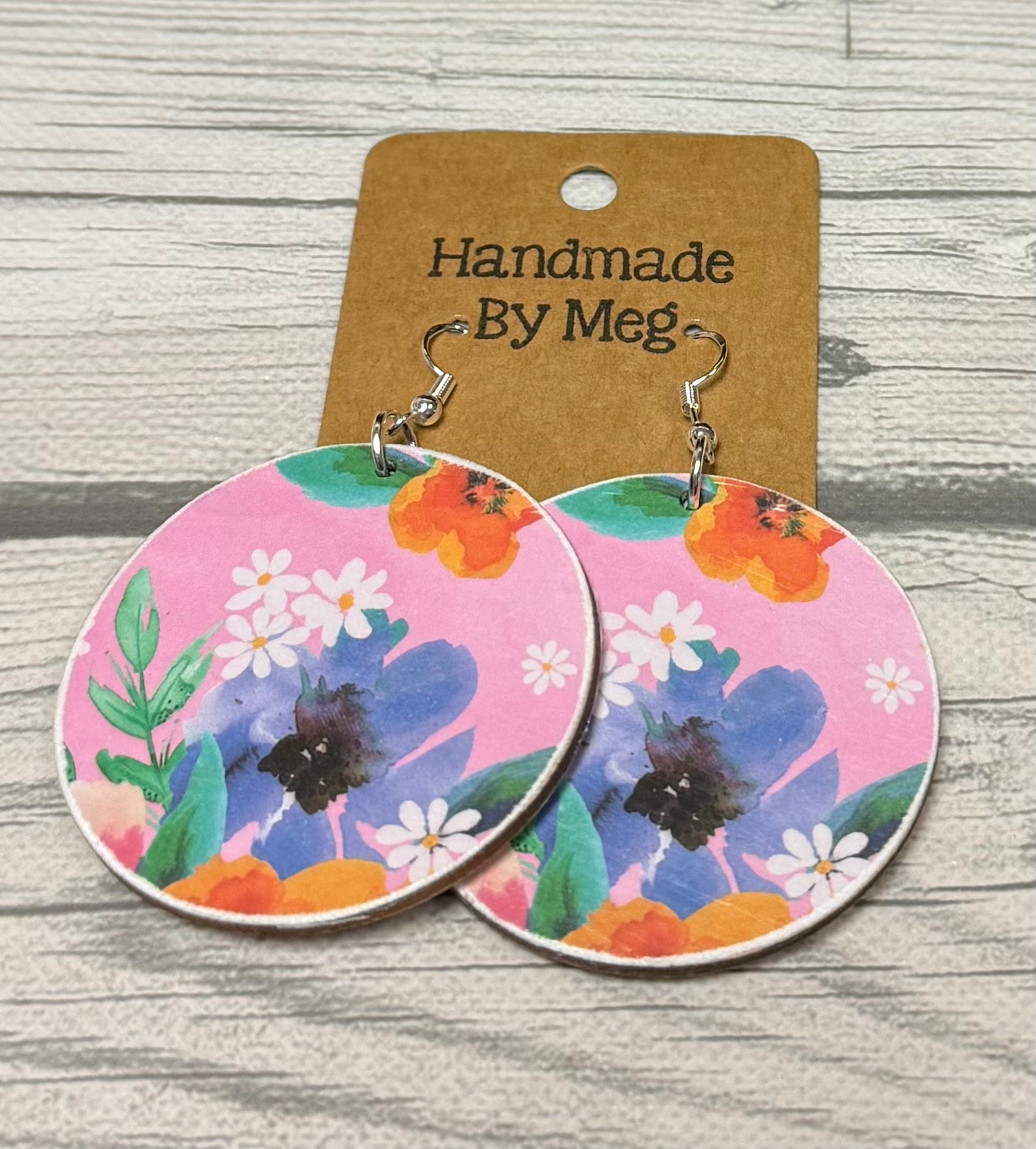 Effortlessly elevate your style with our 2 inch Pink background Floral Earrings. Handcrafted with a chic print on both sides, these earrings are sure to add the perfect touch to any outfit. Measuring 2 inches in diameter, they are the perfect size for everyday wear.