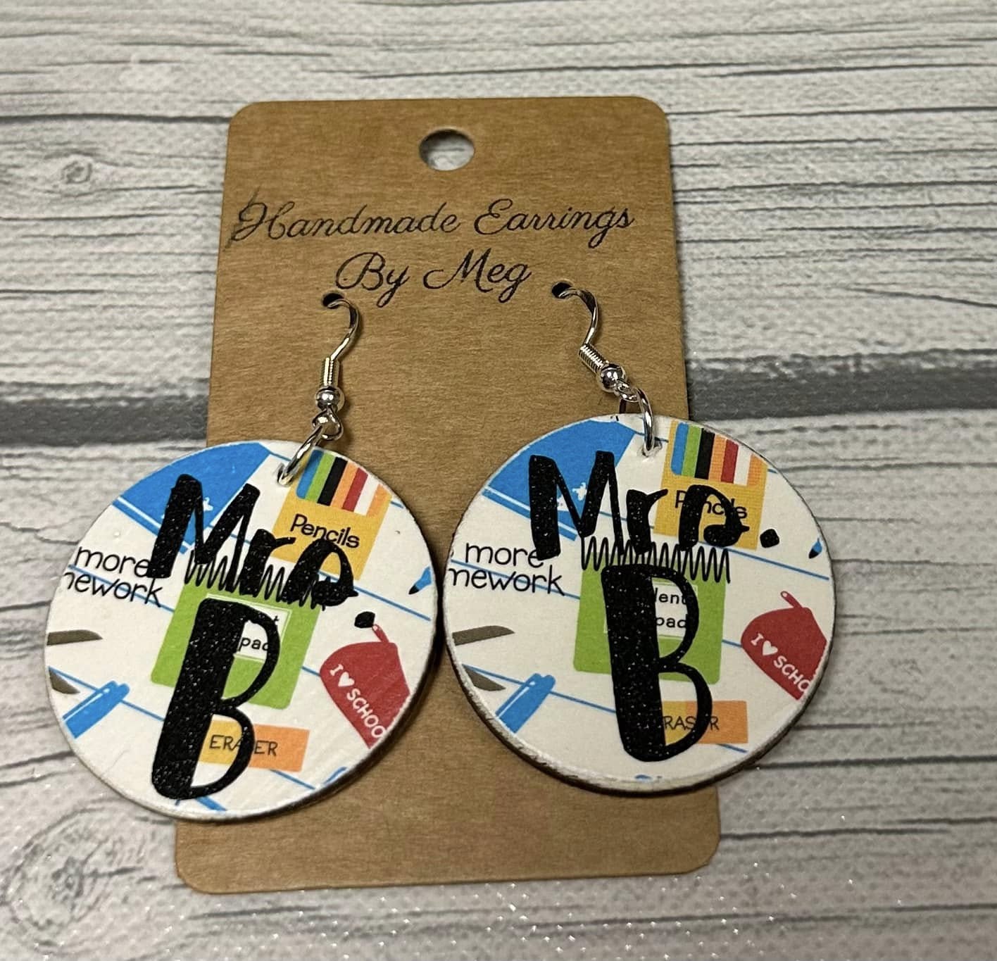 Effortlessly elevate your style with our 2 inch Teacher Monogram Earrings. Handcrafted with a chic school print on both sides and your monogram on the front, these earrings are sure to add the perfect touch to any outfit. Measuring 2 inches in diameter, they are the perfect size for everyday wear.