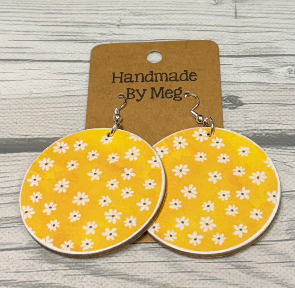 Effortlessly elevate your style with our 2 inch Yellow flower Earrings. Handcrafted with a chic print on both sides, these earrings are sure to add the perfect touch to any outfit. Measuring 2 inches in diameter, they are the perfect size for everyday wear.