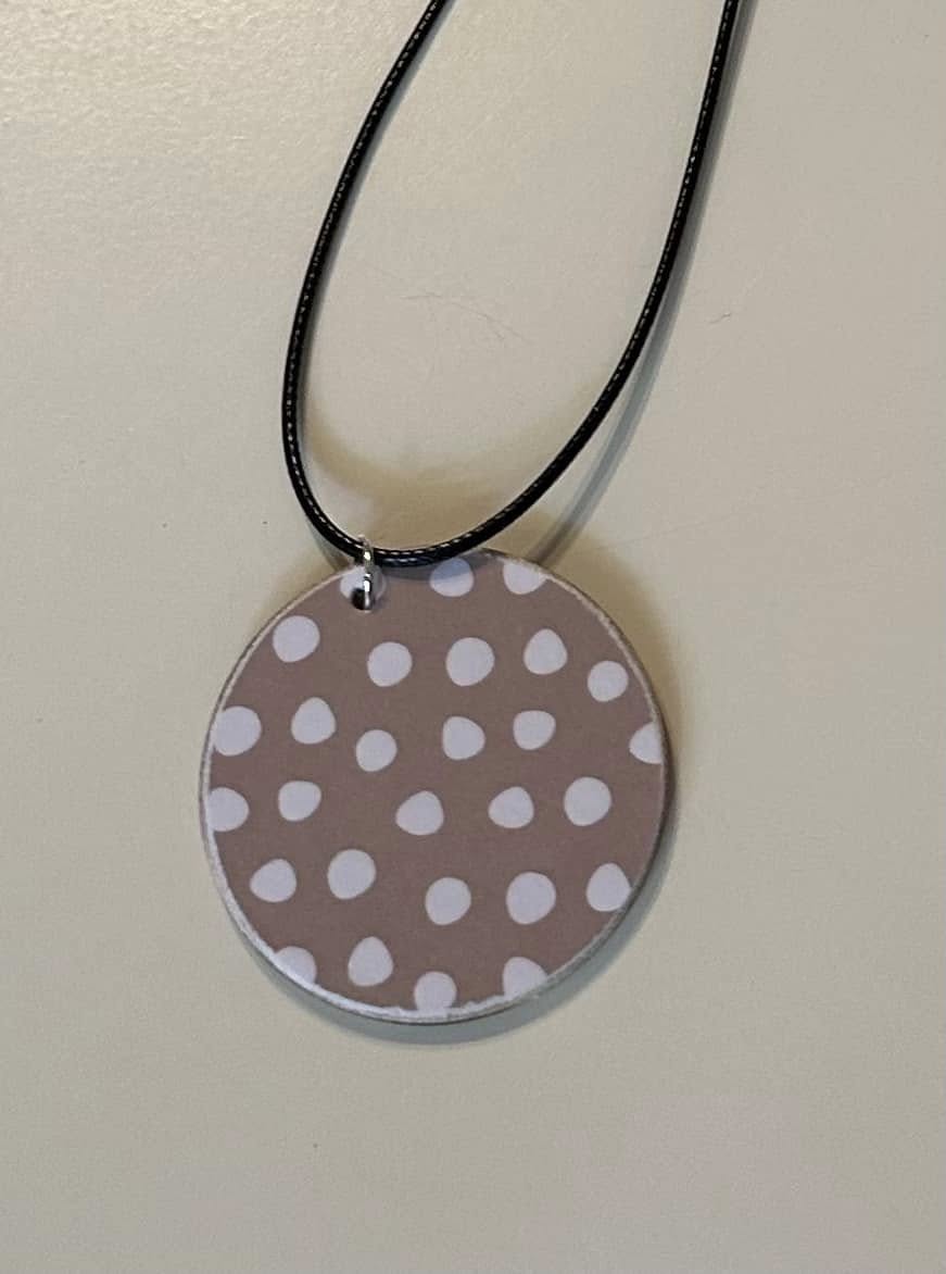 Stylish, handcrafted necklace with a light taupe background and white polkadots on both sides, pendant measuring 2 inches.